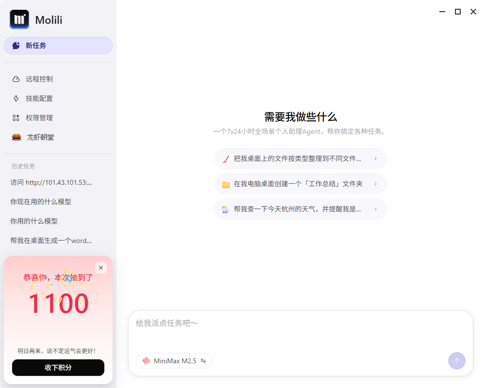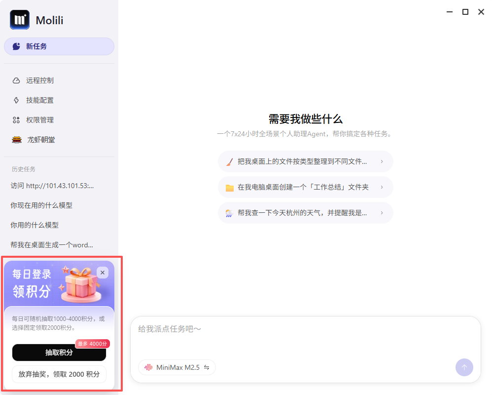 Molili能做的事情很多,不过使用过程中需要消耗积分,那么只有付费用户才能使用吗?答案是否定的,Molili每天都是提供免费积分的,具体Molili免费积分怎么领取呢?下面就分享每天的领取方法。