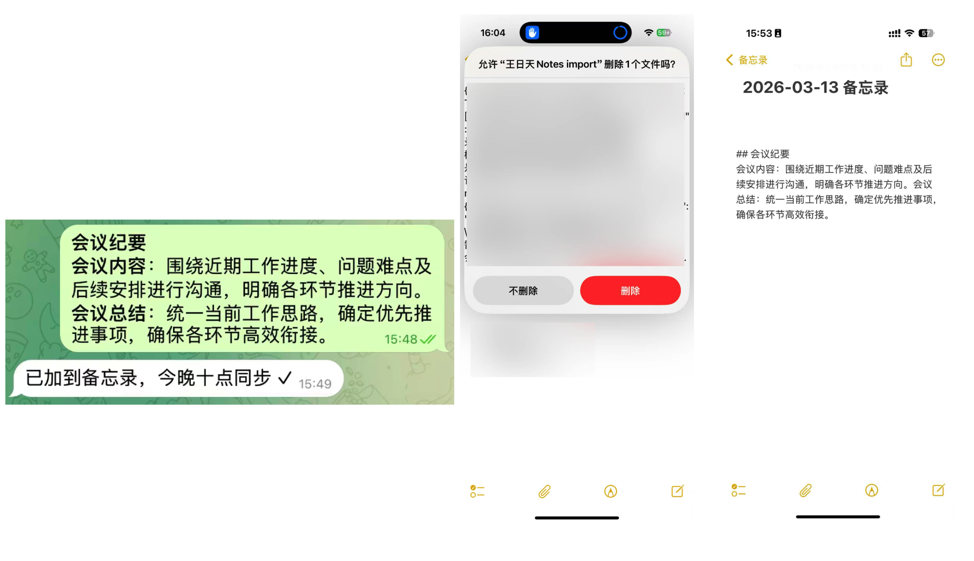 效果:你跟 Molili 说的笔记、想法、灵感,自动同步到 iPhone「备忘录」App。