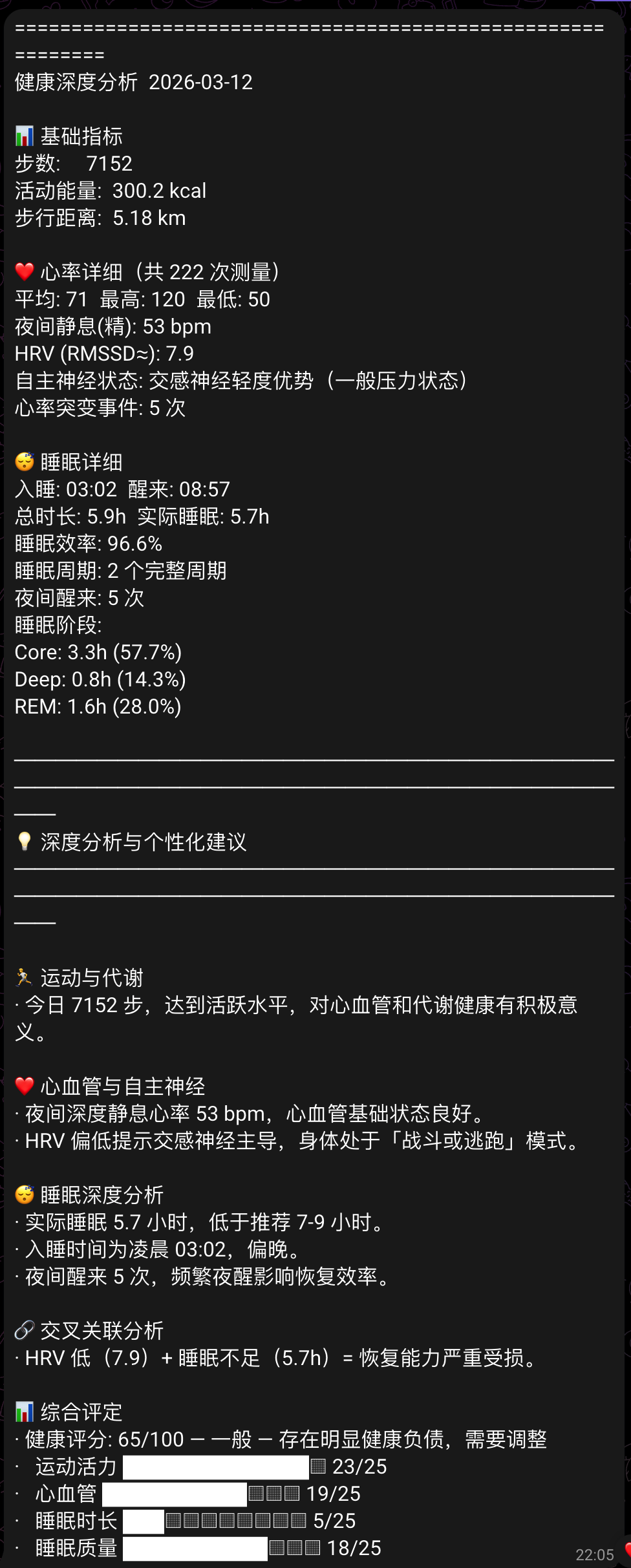 效果:每天自动分析你的心率、睡眠、运动数据,生成健康评分和深度报告。