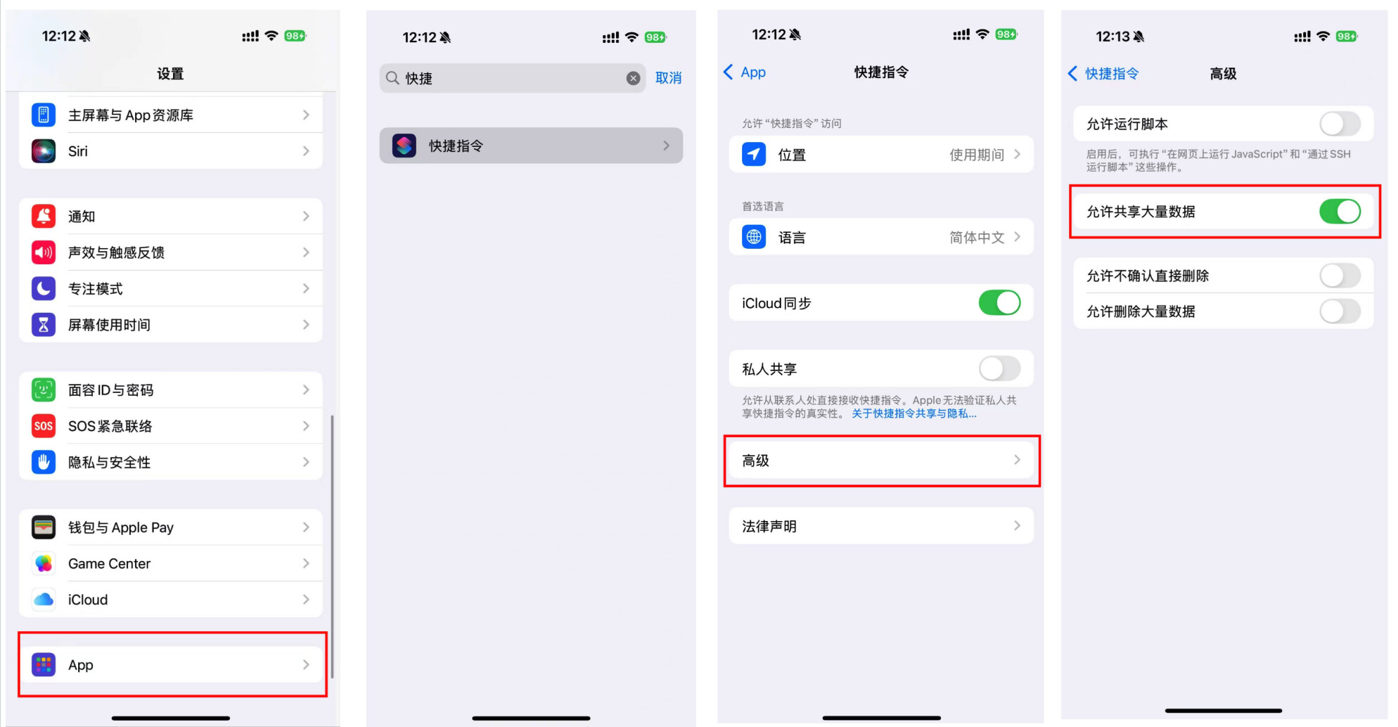 iPhone →「设置」→「快捷指令」→「高级」→ 开启「允许共享大量数据」