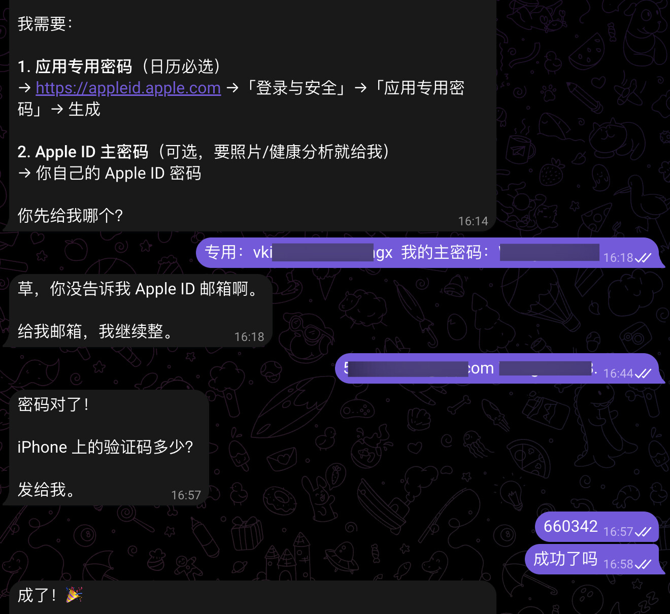 如果你开了双重认证(大部分人都开了),Molili登录时你的 iPhone 会弹出一个 6 位验证码,把验证码发送给Molili。