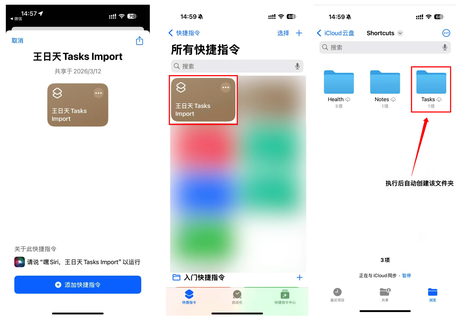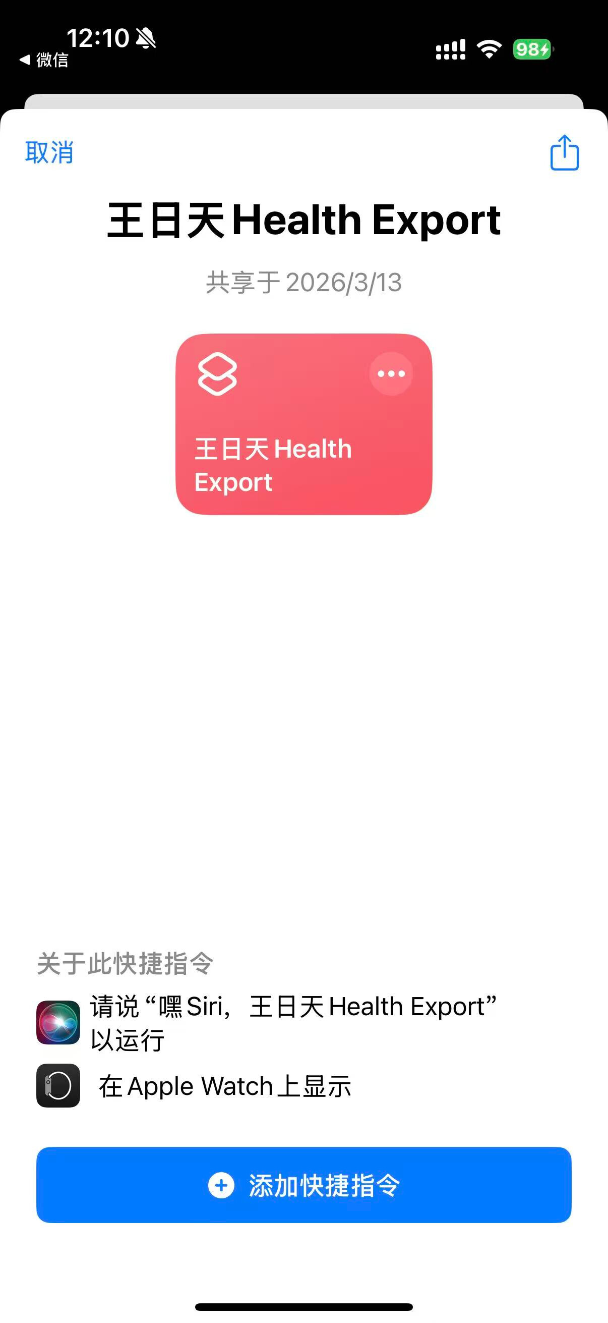 点击「添加快捷指令」。导入后手动运行一次(会创建必要的文件夹)。