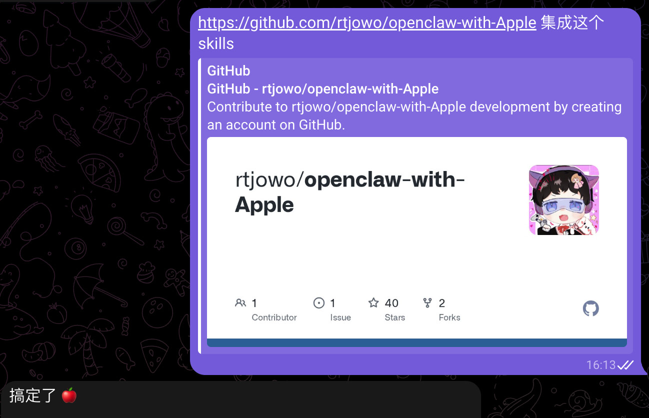 “ 安装这个skills,链接:https://github.com/rtjowo/OpenClaw-With-Apple ”
