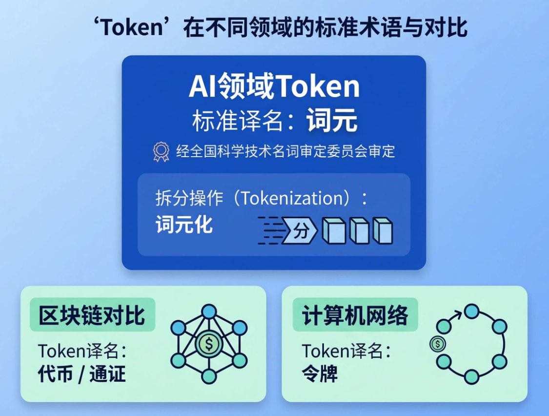 AI/大模型领域:全国科学技术名词审定委员会审定,Token = 词元,文本拆分的过程叫「词元化」,官媒(人民日报)也统一用这个译名。