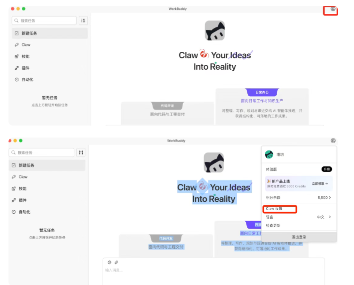回到WorkBuddy,点右上角 你的头像 ,进入Claw设置 。