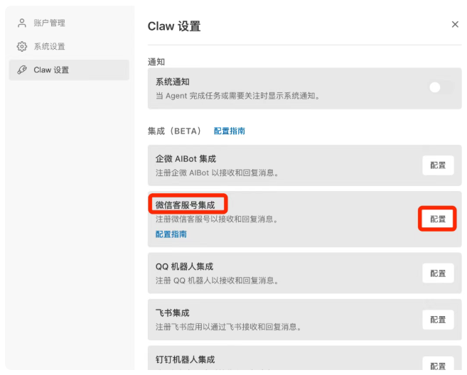 往下滑,在集成列表中找到微信客服号集成 ,点右侧的配置按钮 。