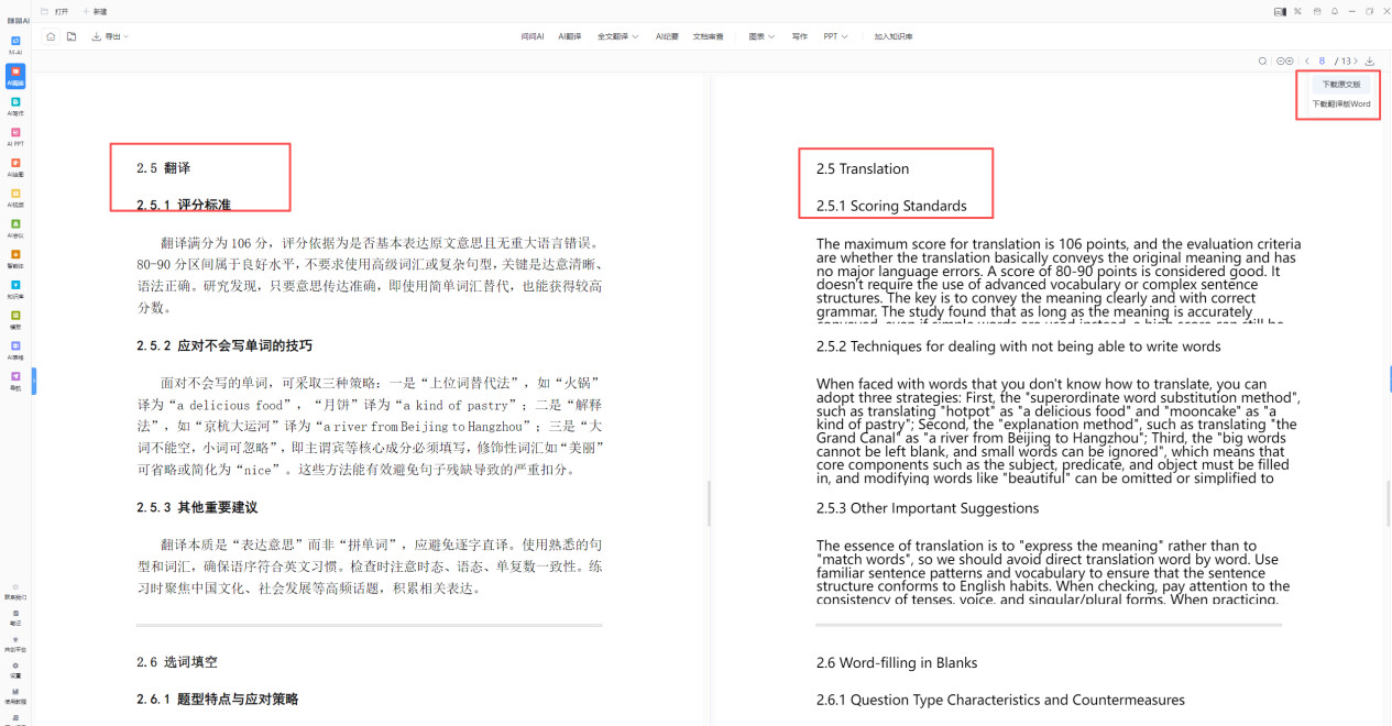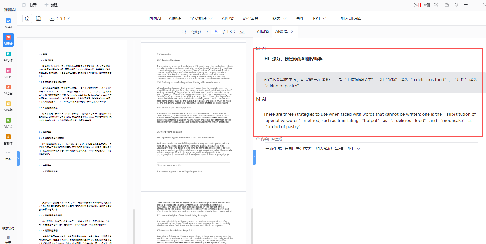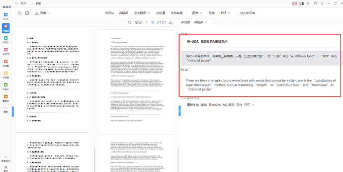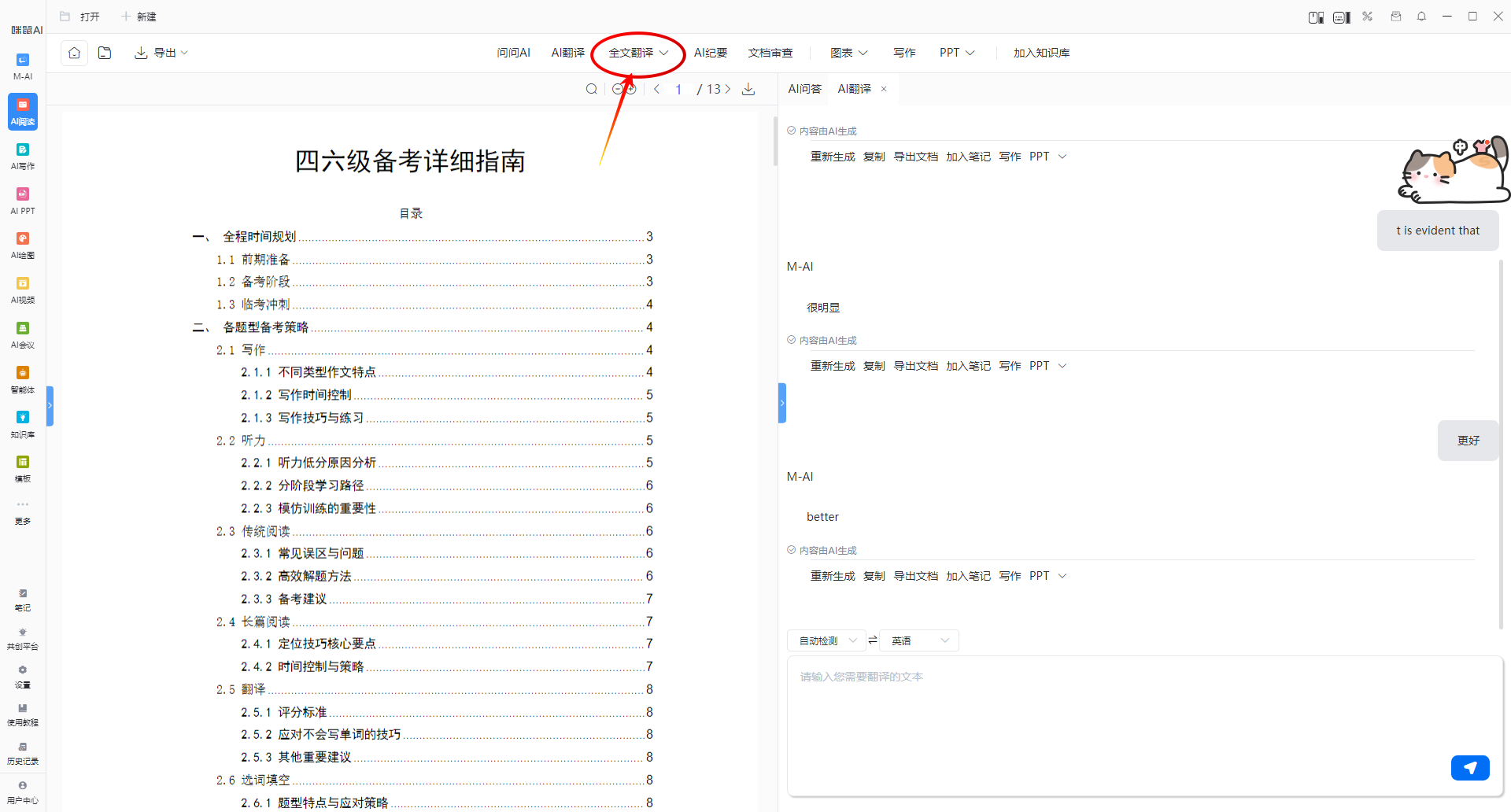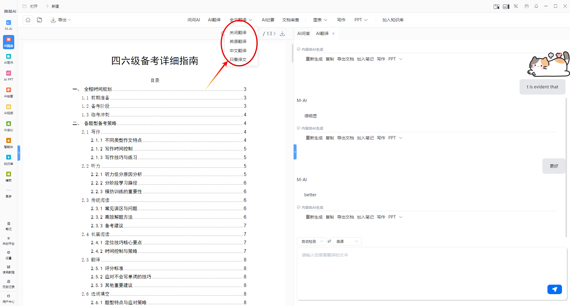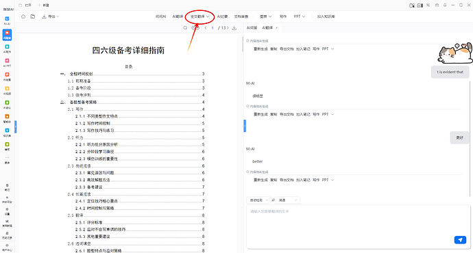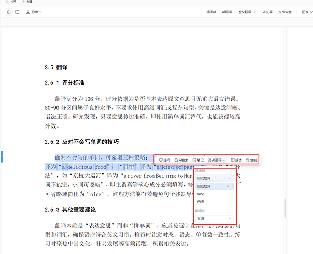 光标选中需要翻译的句子,点击AI翻译,设置语言