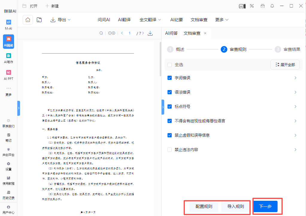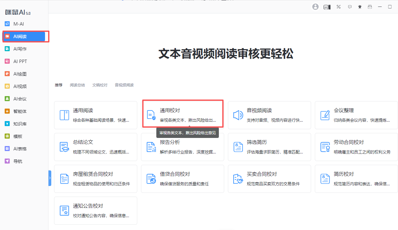 点击左边侧边栏"AI阅读"模块,点击"通用校对"