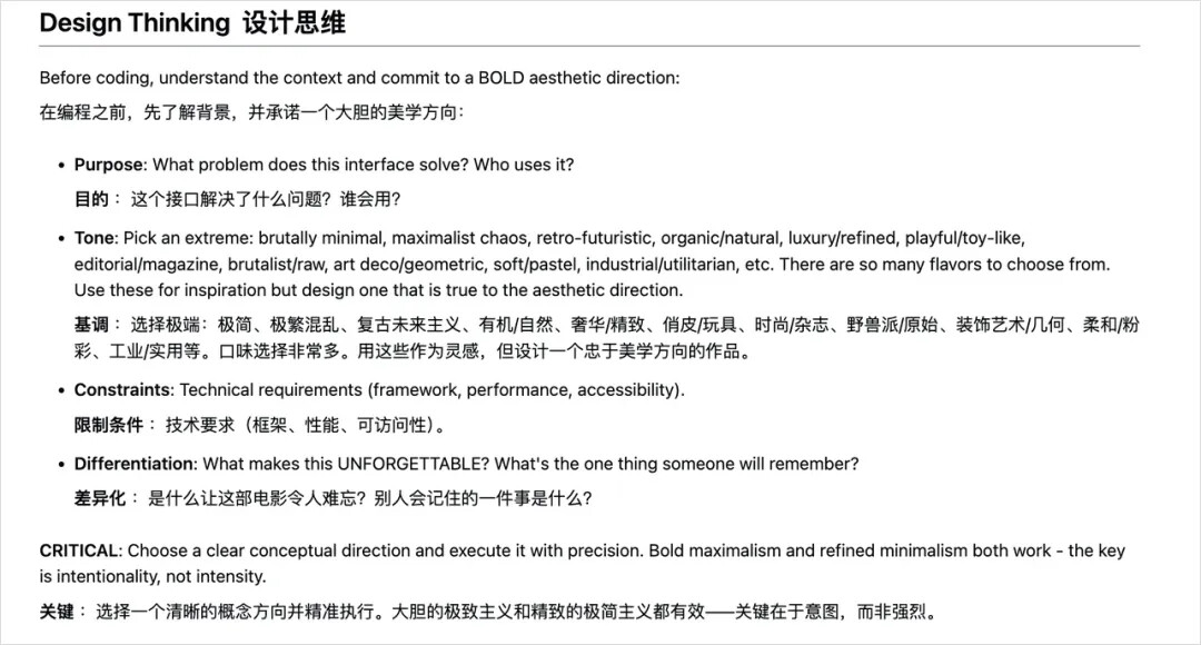 它不是单纯给一堆“美化网页”的空话,它会要求 Agent 在动手写代码之前,先定一个明确的美学方向。极简、复古未来、杂志感、理性科技感,都可以。后面的排版、字体、动效、配色,要围着这个方向走。