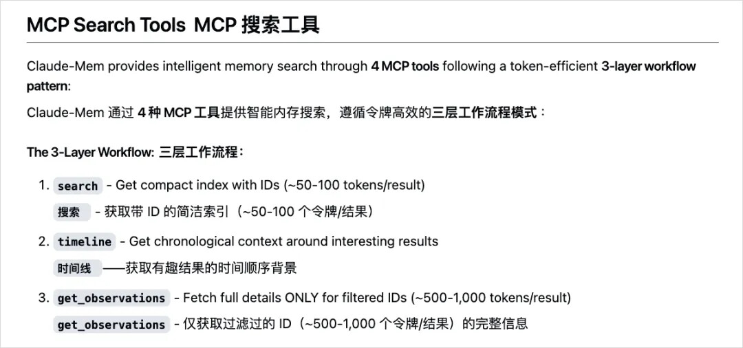 它用的还是比较省 token 的分层检索思路。先看索引,判断有没有相关内容;有的话,再往时间线和细节里取。不是一股脑把所有历史都塞进来,所以整体还算克制,不会显得很臃肿。