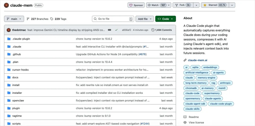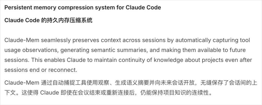 Claude Code、Codex 这类工具,本身在这块一直没那么完整。于是就有人专门做了 Claude-mem,给它补上长期记忆这一层。