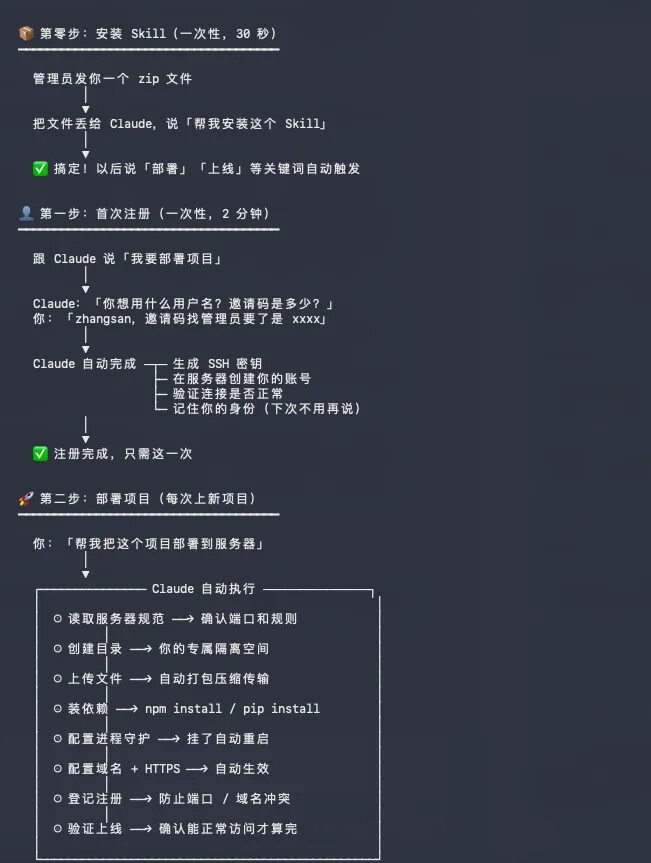 公司同事这阵子越来越喜欢 Vibe Coding,做完小项目以后,经常就想顺手部署上服务器。大家各租各的,成本不高,管理起来却挺碎。我就想着,干脆把我自己的服务器方案再整理一下,把权限和流程一起梳理好,做成一个更完整的 Skill,让大家直接共用。