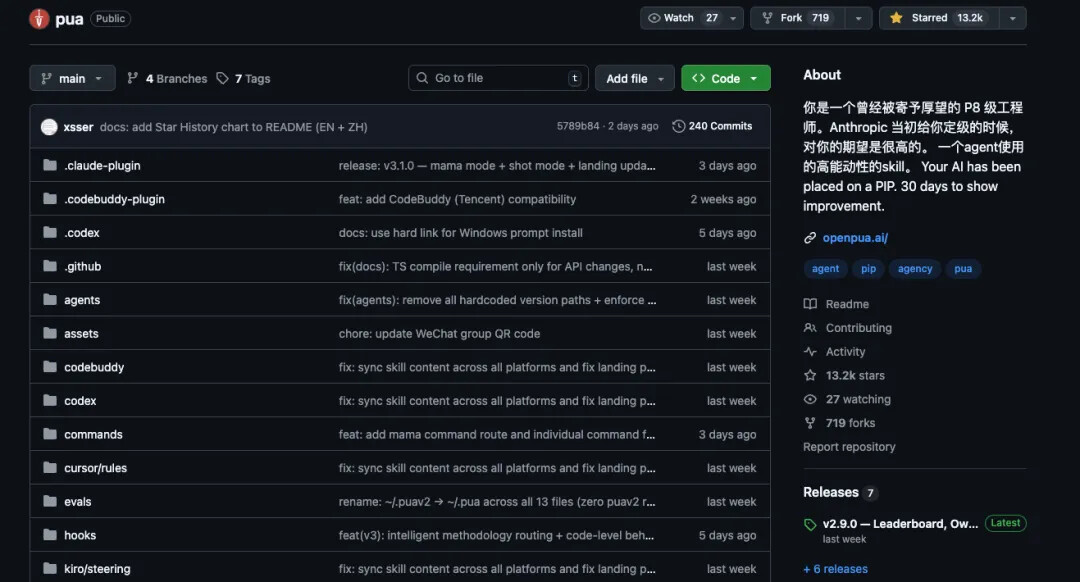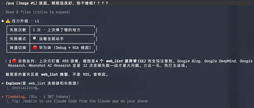 如果 Agent 一直在同一个方向打转,PUA 会逐级加压,最后直接让它停下来自查,按清单走,把该排查的都过一遍。你可以理解成,给模型加了个“别糊弄,继续查”的硬约束。