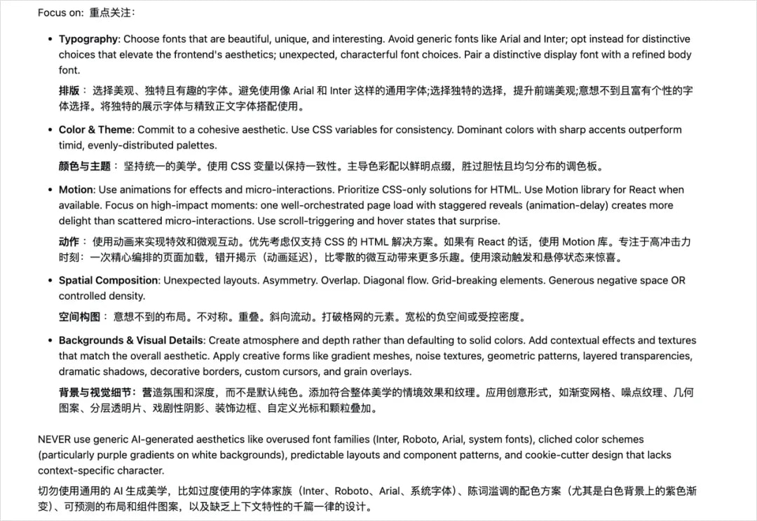 它甚至有一些很明确的限制。比如别老盯着 Inter、Roboto、Arial 这些最常见的字体,也别一上来就紫色渐变加白底。这种限制其实挺重要,不然模型很容易滑回那套最熟悉、也最偷懒的解法。