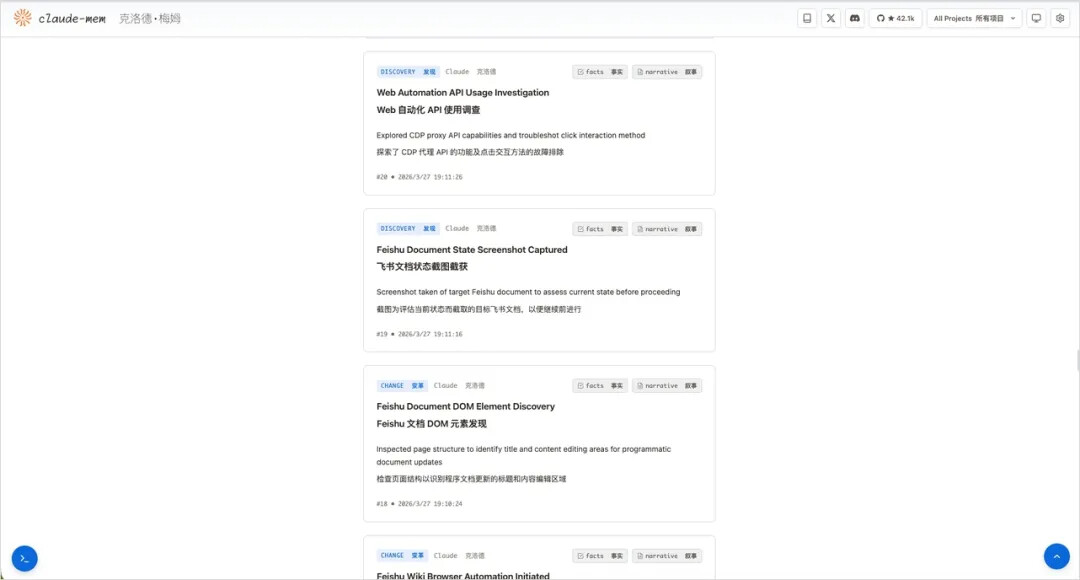 有了 Claude-mem 以后,这些信息至少能沉下去一部分。