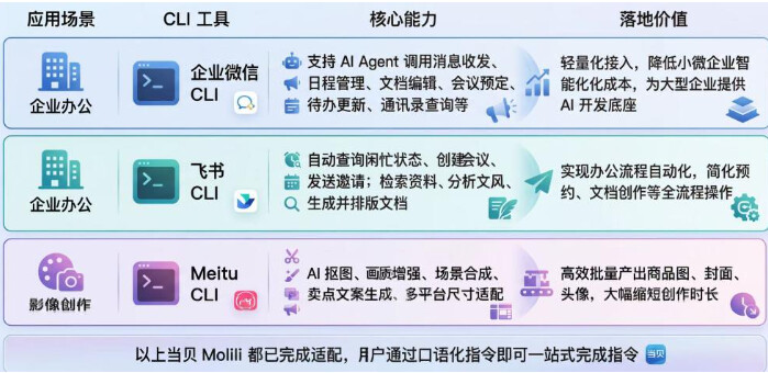 CLI 正深度赋能 AI 办公与创作:企业微信 CLI 开源后,AI Agent 可轻量化调用消息、日程、文档、会议、通讯录等办公能力,降低小微企业智能化成本,也为大型企业提供开发底座。