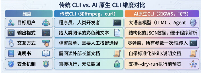 如今的AI原生CLI,早已不是程序员专属的硬核工具,而是经过彻底重构的智能交互载体。与传统CLI相比,新一代CLI在设计理念上实现了全方位革新: