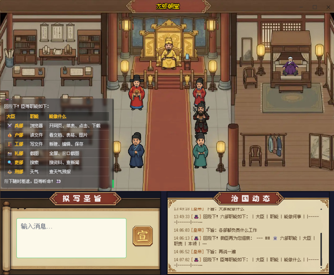 新增「龙虾朝堂」互动玩法!用户可以发布圣旨控制手下六部,六部会遵循你的指令为你工作,具体六部职责如下:
