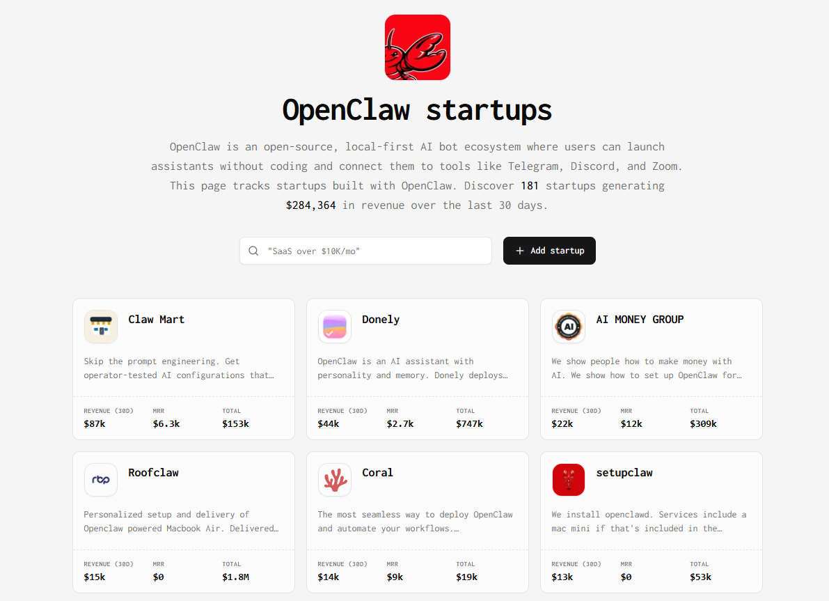 2、这个网站更离谱,直接统计了用 OpenClaw 赚钱的实例公司