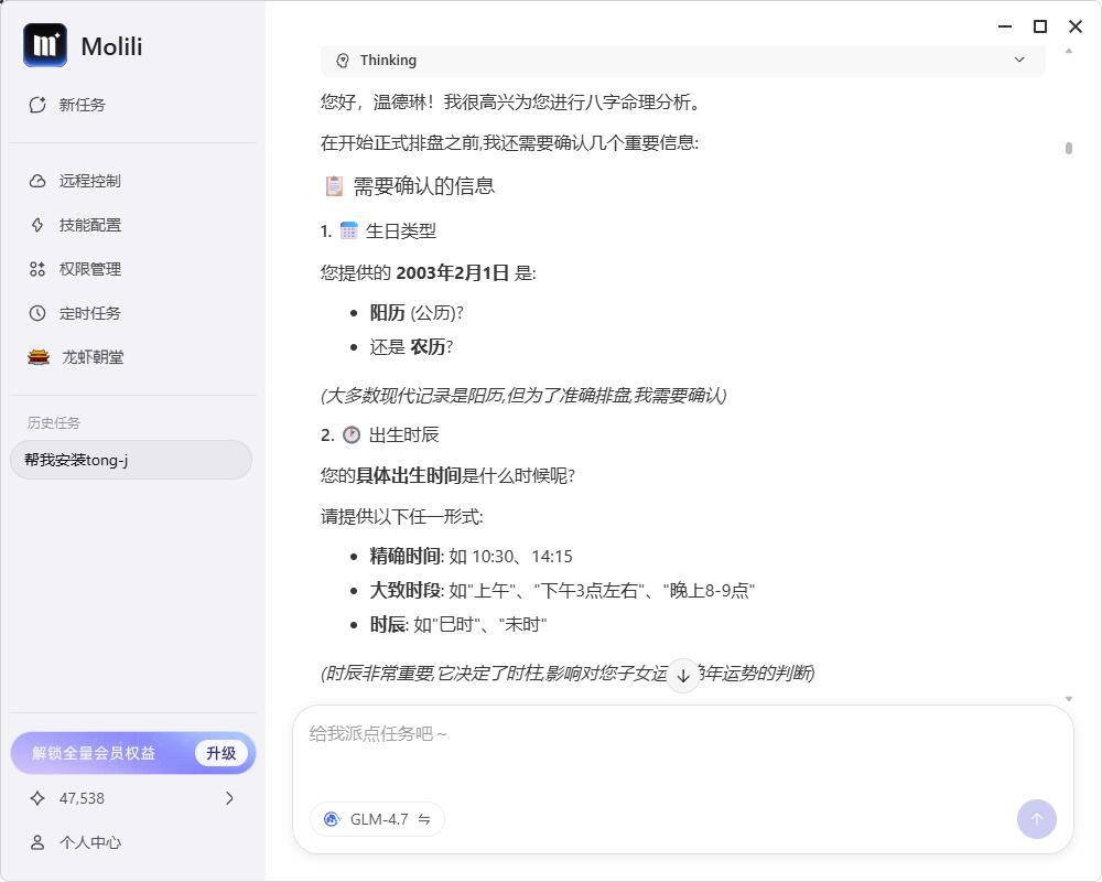 由于我最初未提供具体的出生时辰,Molili 展现了极高的严谨性,它主动反问我具体的出生时刻。提供更精确的时间,这样推演结果显然也会更具参考价值。