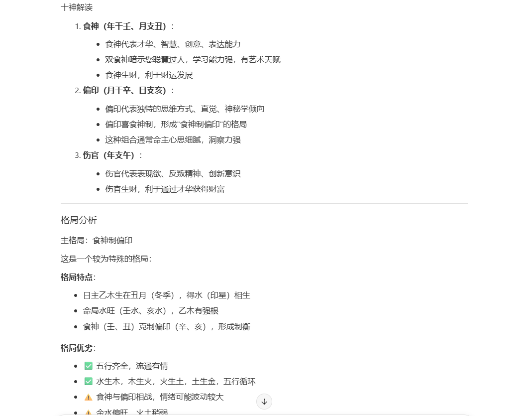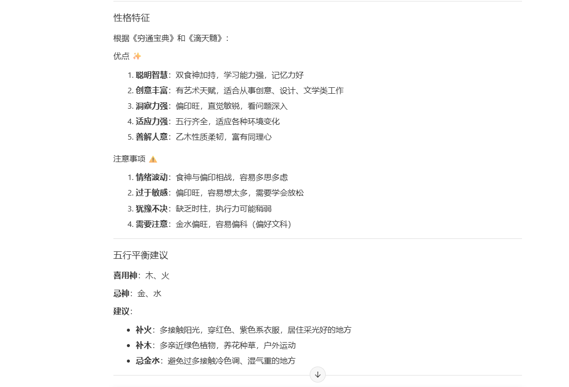 生成的报告内容非常全面:涵盖了六字命盘(缺时辰则为六字)、十神解析、格局判定、性格特征。此外,系统还给出了五行平衡建议、事业发展方向、财运趋势以及感情婚姻分析等等等等。给大家看看。