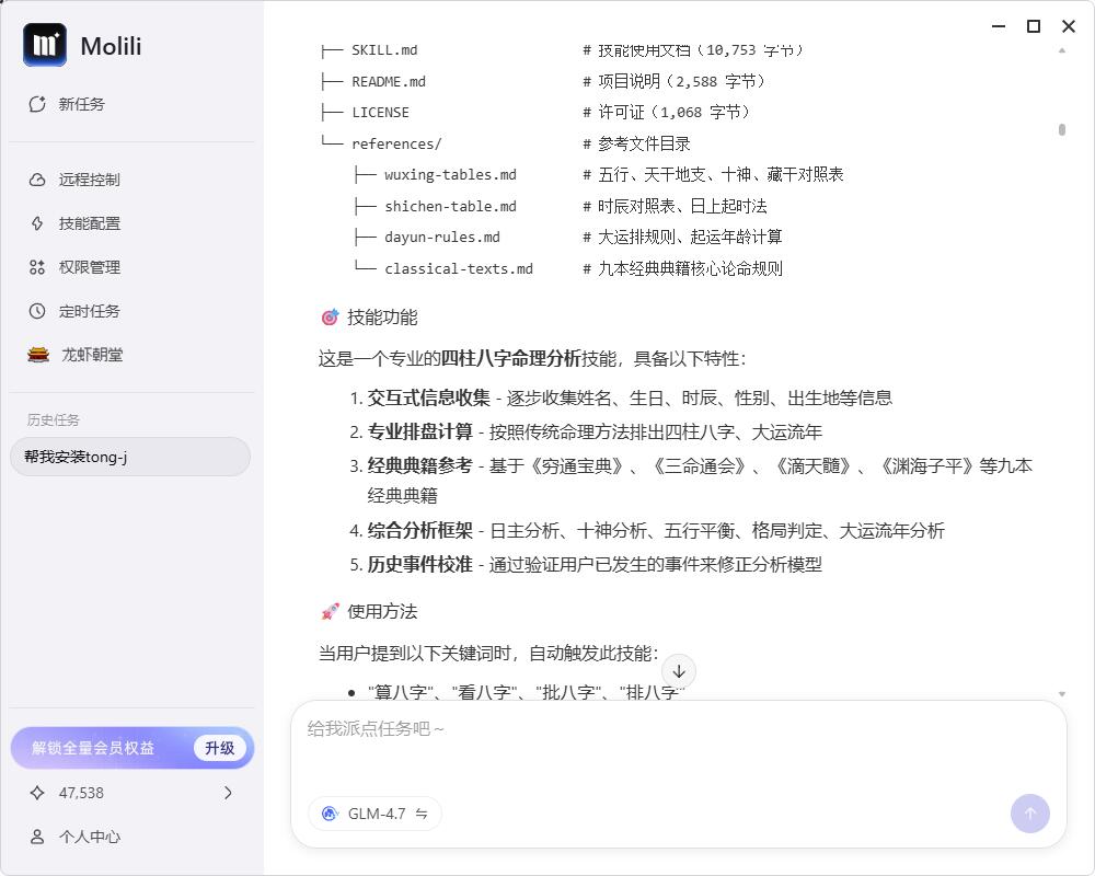 传统文化遇见人工智能,Molili 帮你赛博算命!无需出门寻访线下档口,直接在对话里解析命理。这款 bazi-skill 技能逻辑有趣,分析详尽全面,可能真的能当独属于你的算命先生!