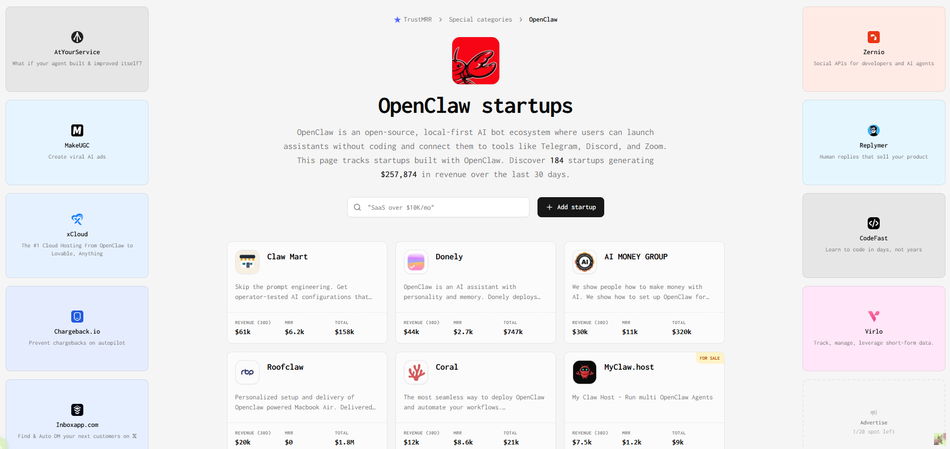 第一个挺有意思,甚至可以说有点“离谱”,它直接统计了用OpenClaw赚钱的实例公司。这个站会让你更直观地看到,OpenClaw并不只是技术圈里自己玩的小工具,已经有人把它真正做成了业务,跑出了收入,甚至形成了商业闭环。对很多还在观望的人来说,这种内容比单纯看功能介绍更有冲击力。