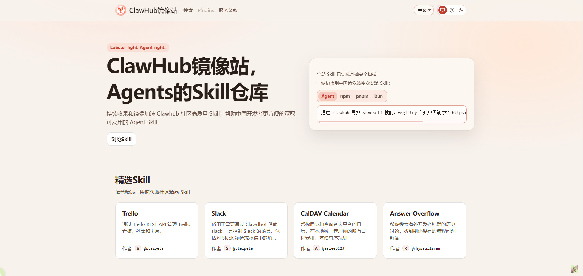 第四个是ClawHub官方的中国镜像网站。这个站点的价值不用多说,懂的都懂。很多时候访问速度、下载体验、资源同步效率,都会直接影响你对工具的第一印象。国内用户想更顺一点地浏览、获取相关资源,这个镜像入口会友好很多,用起来也更接地气。