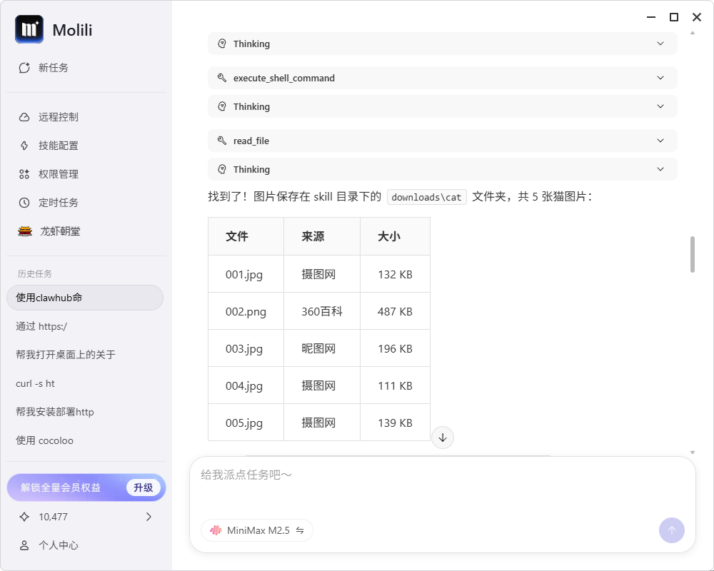 可以让Molili将图片发送给你,也可以让其提供图片的本地地址使用。