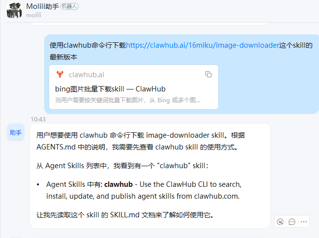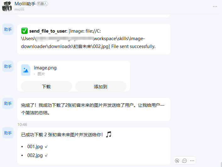在技能安装完成后,发布图片下载指令让Molili相关图片,指令如下;