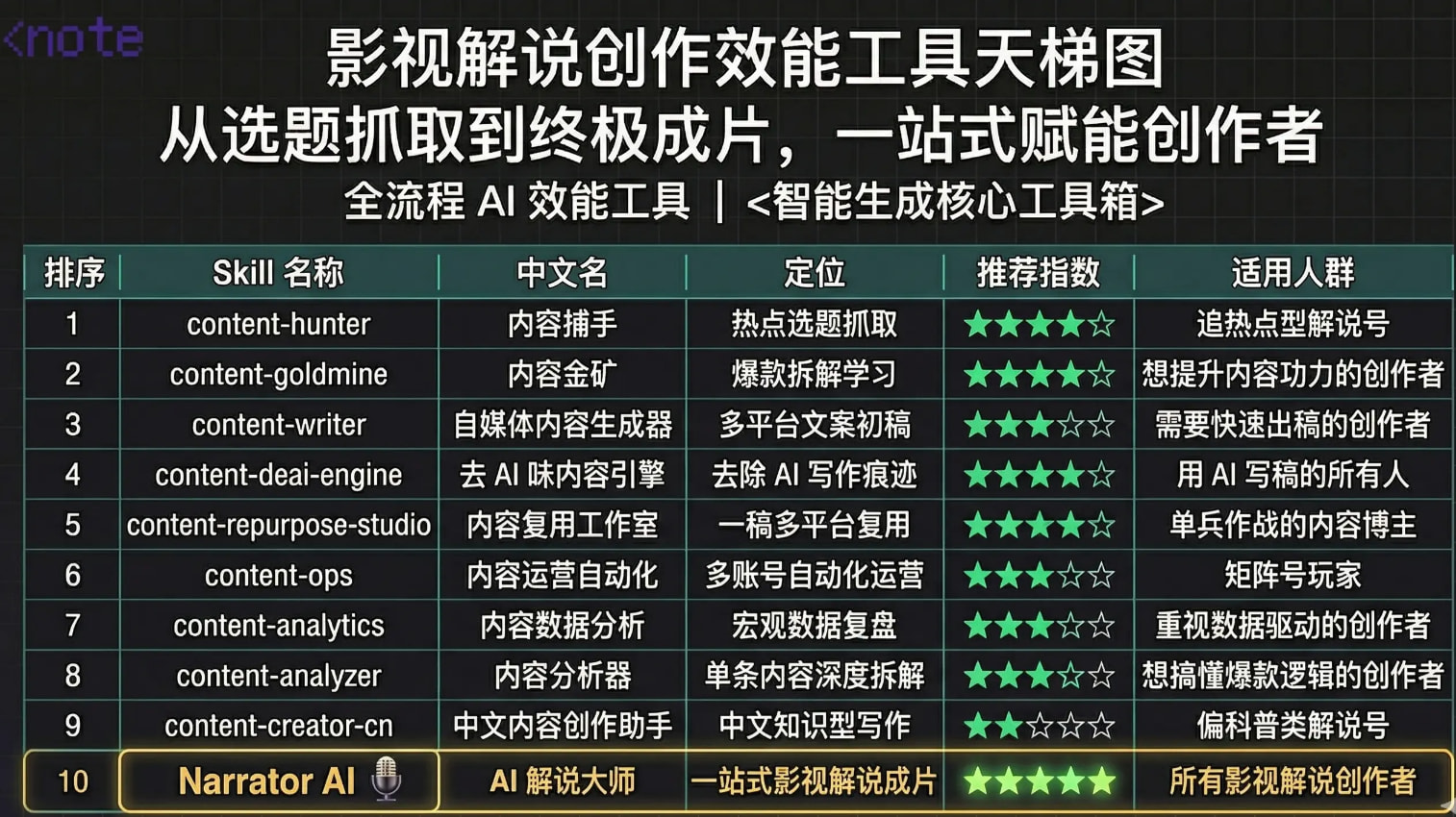 最近把Claude上能用的内容创作类Skill挨个测了一遍,专门站在影视解说创作者的角度做了筛选和打分。市面上Skill越来越多,但真正能用在影视解说工作流里的其实没那么多。这篇做一个盘点,每个Skill给出实测体验、推荐指数和推荐理由,方便大家对号入座。