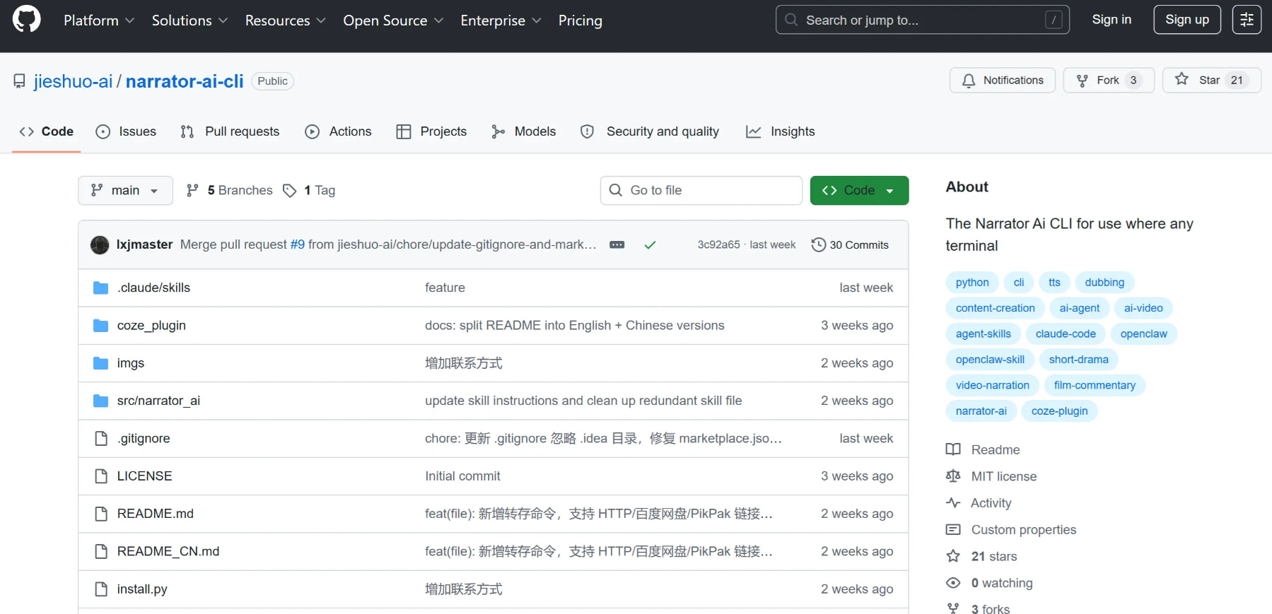 https://github.com/jieshuo-ai/narrator-ai-cli - 一行命令安装:
