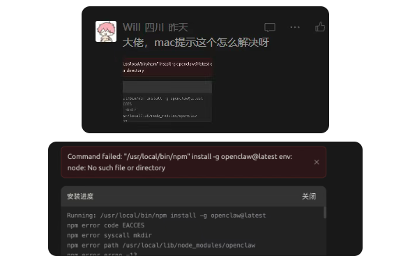 问题二:Mac 用户——“env: node: No such file or directory” / 权限错误