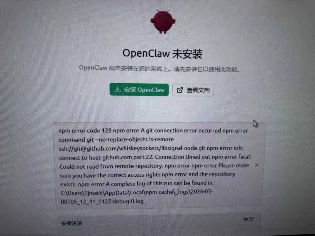 多试几次,有时候是偶发性网络波动,重新点击"安装 OpenClaw"即可。