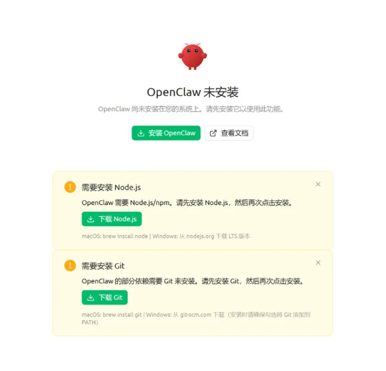 问题一:安装了 Node.js 和 Git,但 OpenClaw 还是显示"未安装"