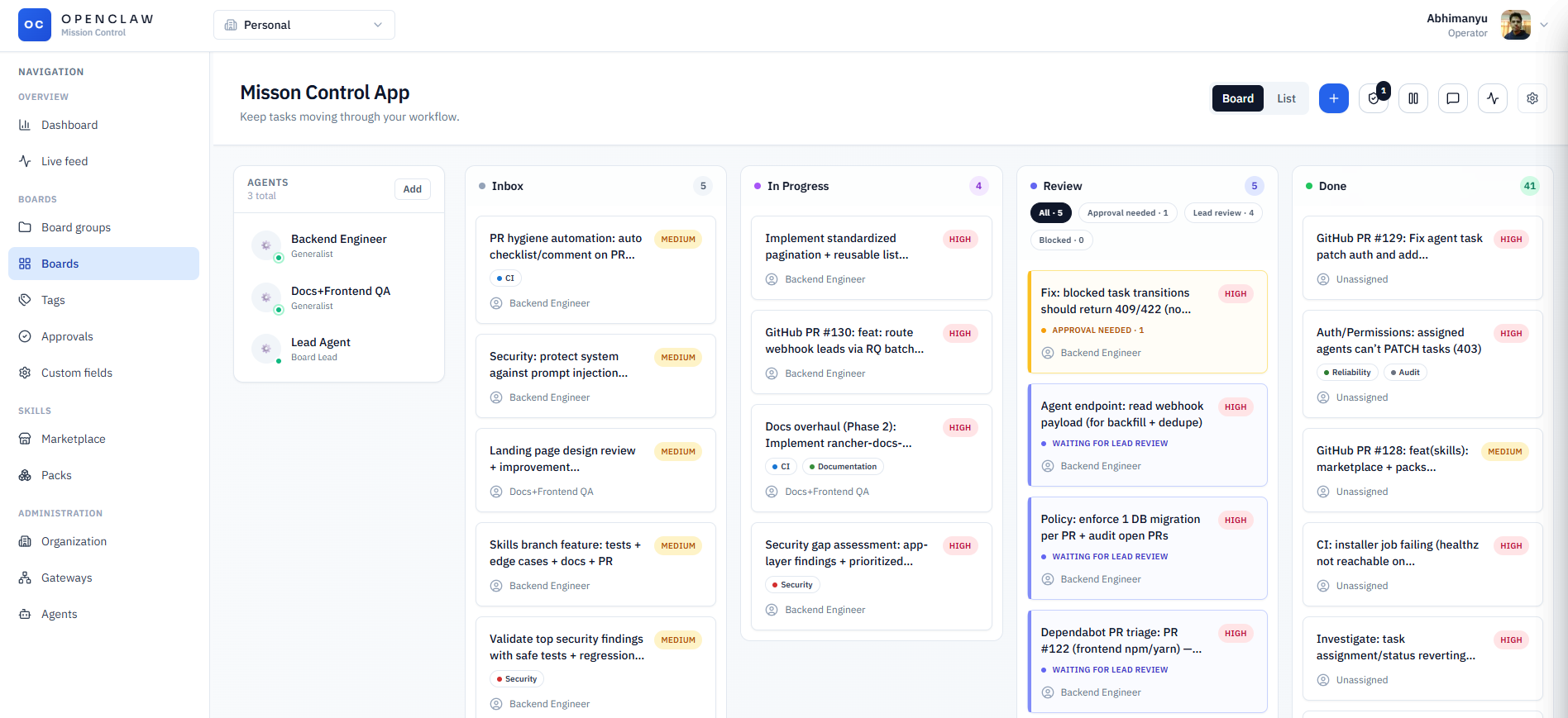 OpenClaw Mission Control 是一个集中式运维和治理平台,用于跨团队和组织运行 OpenClaw,提供统一的可见性、审批控制和网关感知编排。它为运维人员提供了一个统一的界面,用于工作编排、代理和网关管理、审批驱动的治理以及 API 支持的自动化。