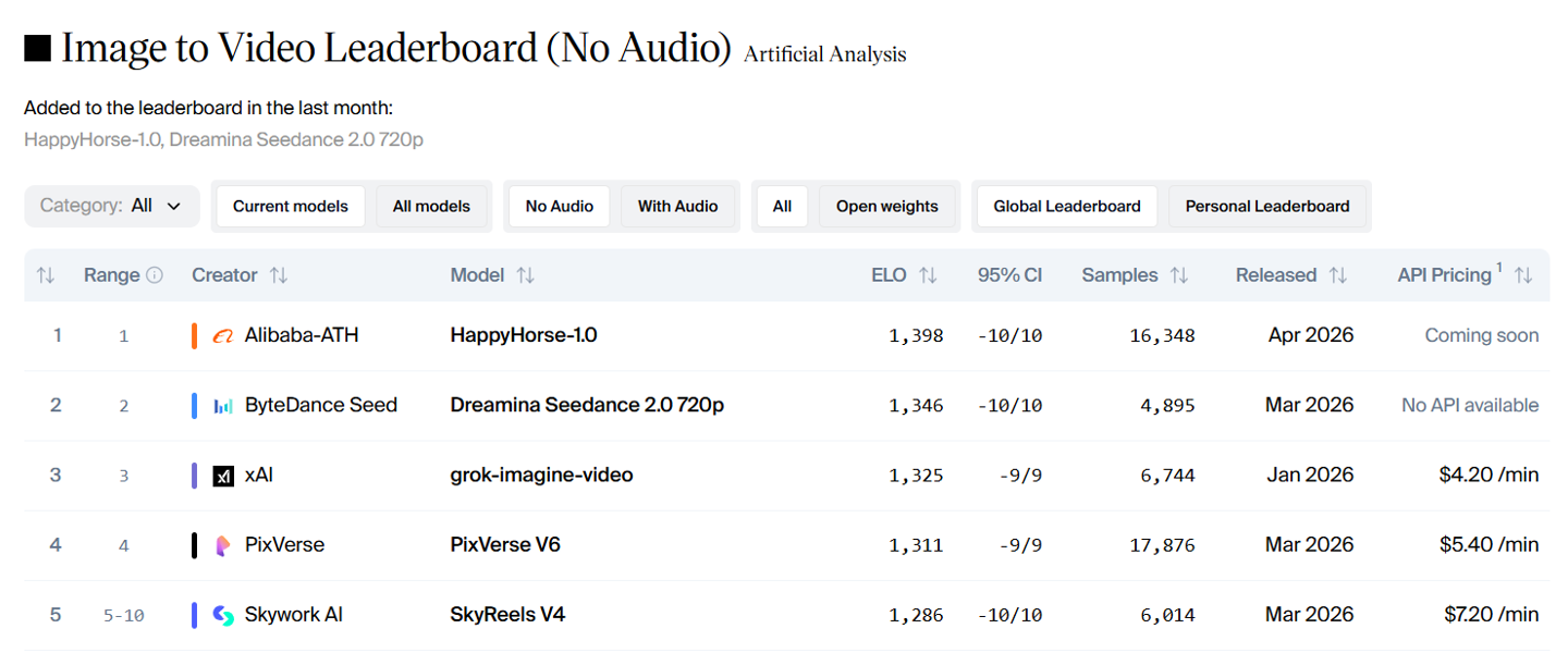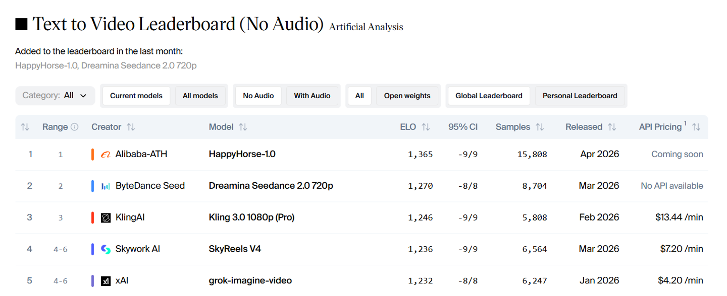 查询获悉,HappyHorse-1.0 目前登顶 Artificial Analysis 的 AI Video Arena 排行榜,超过了字节跳动的 Seedance 和快手可灵等模型。