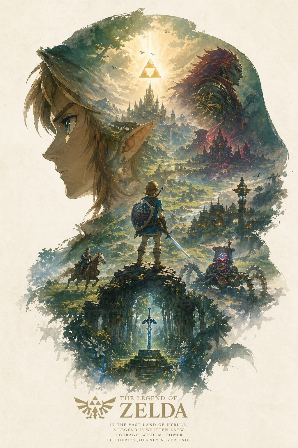 根据【主题】自动生成一张收藏版史诗叙事海报:巨大的【具体人物/物体】侧脸剪影作为外轮廓,剪影内部自动生长出最契合该主题的完整世界观、标志性场景、角色关系、象征符号、关键建筑、生物、道具与氛围【具体描述】。整体不是普通拼贴,而是高级的剪影轮廓填充式叙事合成,带有双重曝光式联想,但更偏电影海报与梦幻水彩插画融合风格;柔和空气透视,轻雾化过渡,纸张颗粒,边缘飞白与刷痕,大面积留白,版式克制高级,安静、宏大、神圣、怀旧、诗意、传说感【你想要的其他描述词】。风格、色彩、场景、材质全部根据主题自动适配,所有元素必须强绑定主题,一眼识别,不要杂乱,不要硬拼贴,不要模板化背景,不要廉价奇幻素材。
