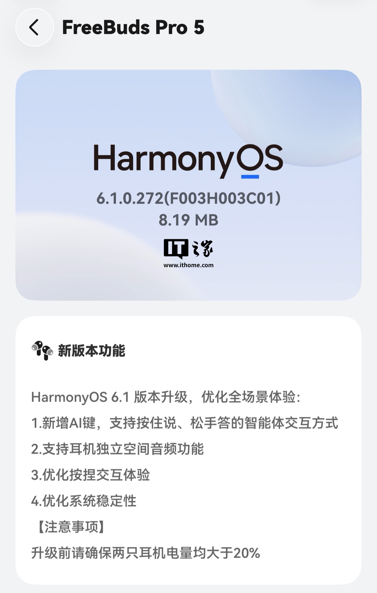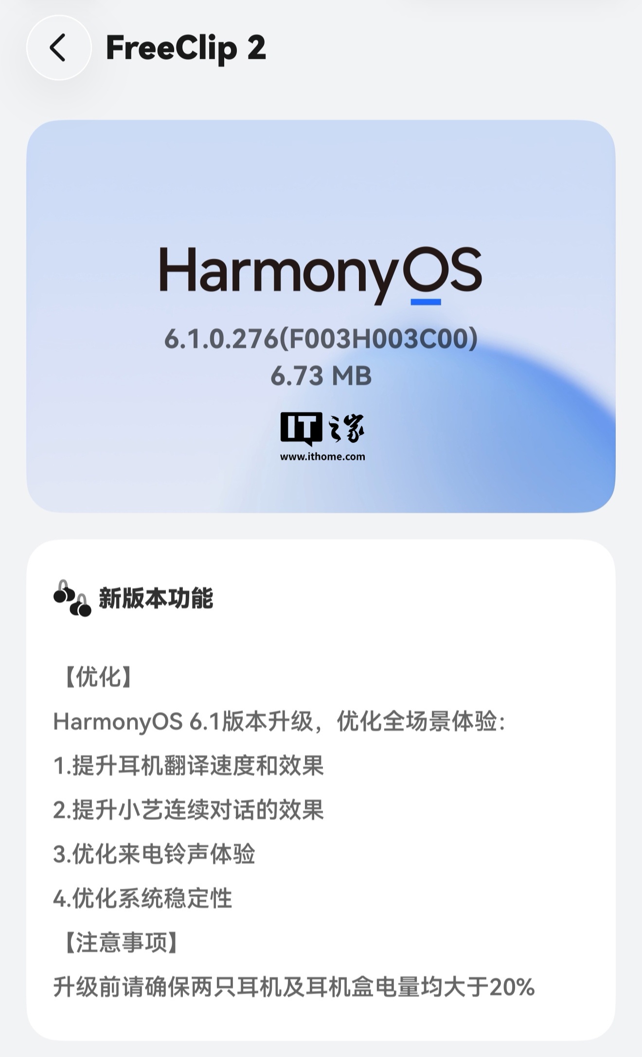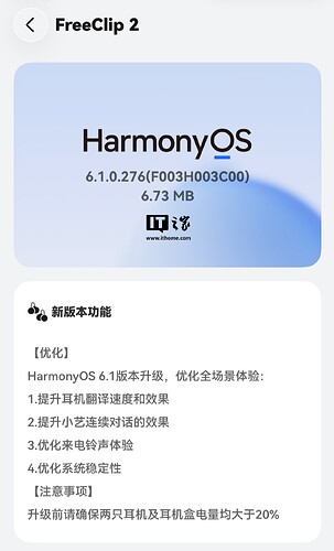 目前,华为 FreeClip 2 耳夹式耳机和 FreeBuds Pro 5 旗舰降噪耳机也开启了鸿蒙 HarmonyOS 6.1 版本的升级,版本号分别为 6.1.0.276(FreeClip 2)和 6.1.0.272(FreeBuds Pro 5)。