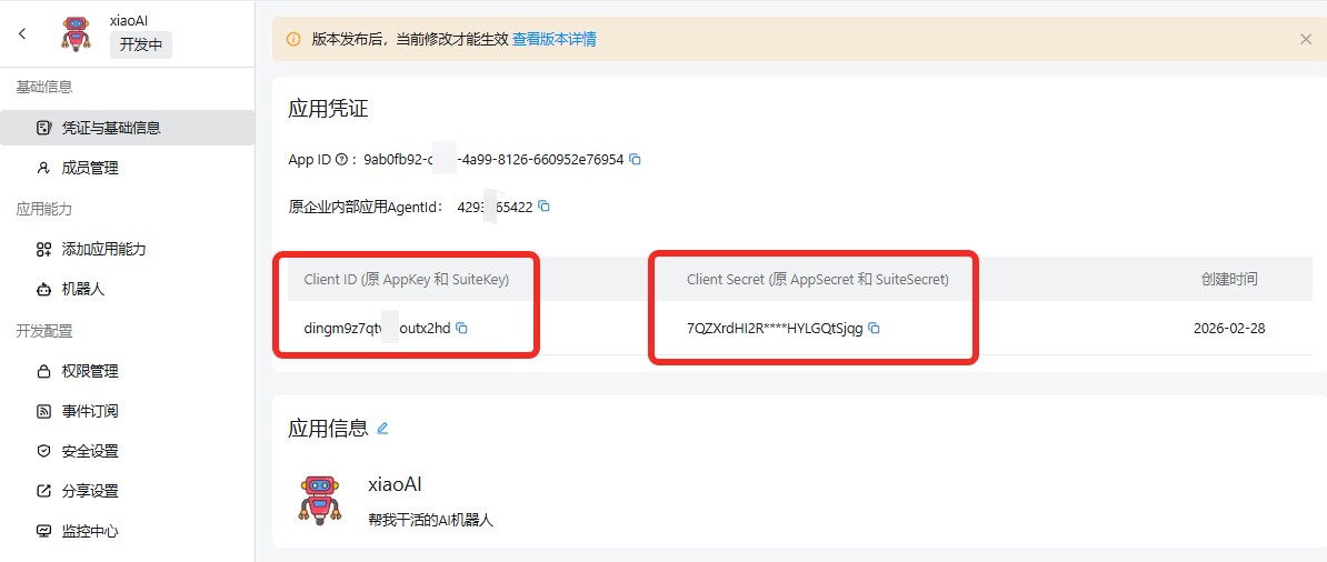 8、在【凭证与基础信息】复制Client ID和Client Secret,填写到Molili的钉钉配置中,点击保存。