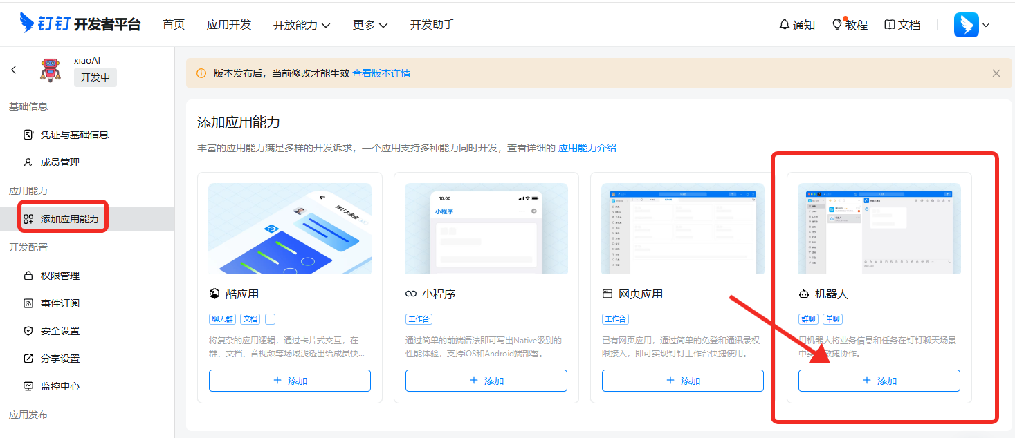 7、给机器人加权限,需要3个权限,分别是:Card.Streaming.Write、Card.Instance.Write 、qyapi_robot_sendmsg,可以分别复制这3个名字,在【权限管理】搜索一下,点击【立即开通】