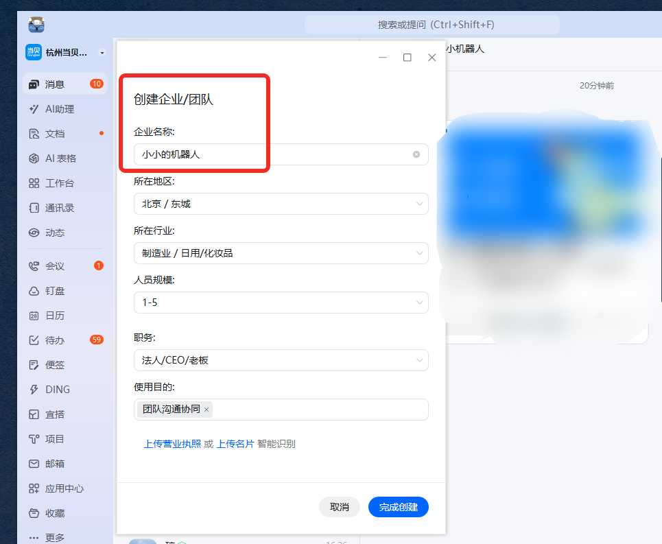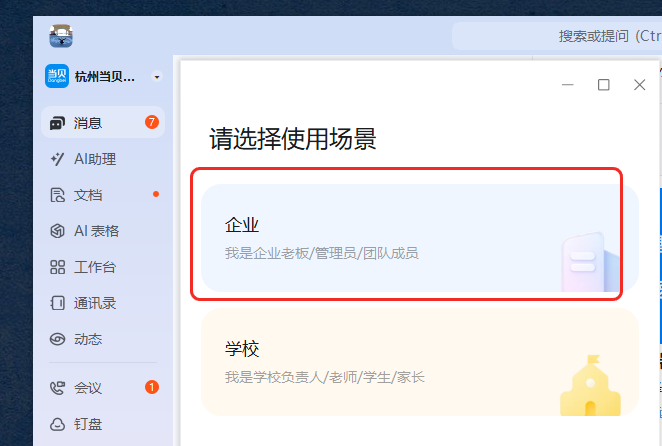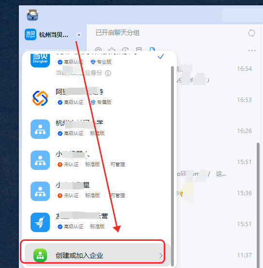 1、在钉钉左上角,点击一下下拉,选择【创建或加入企业】