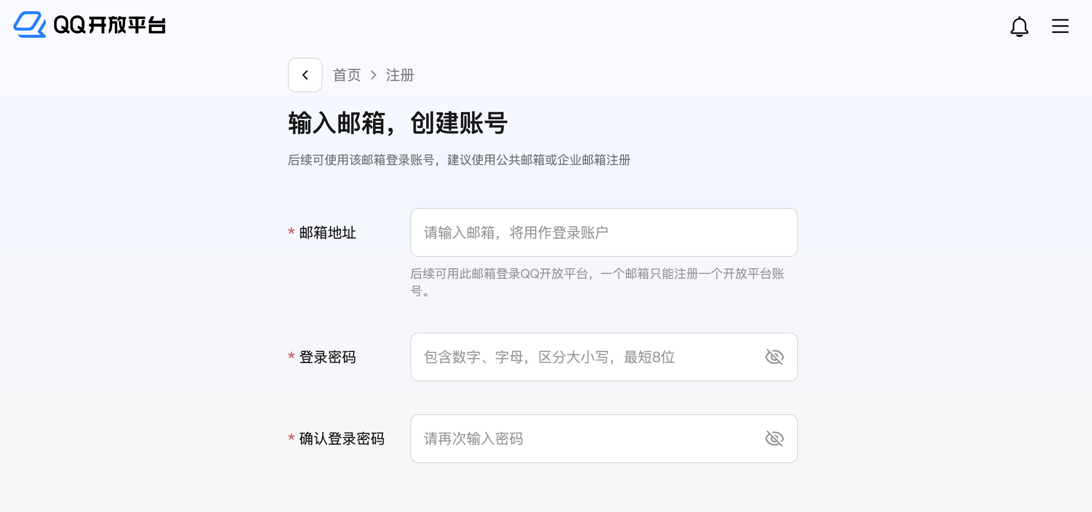 前往腾讯 QQ 开放平台 官网,默认无法使用 QQ 账号直接登录,需要新注册 QQ 开放平台账号。
