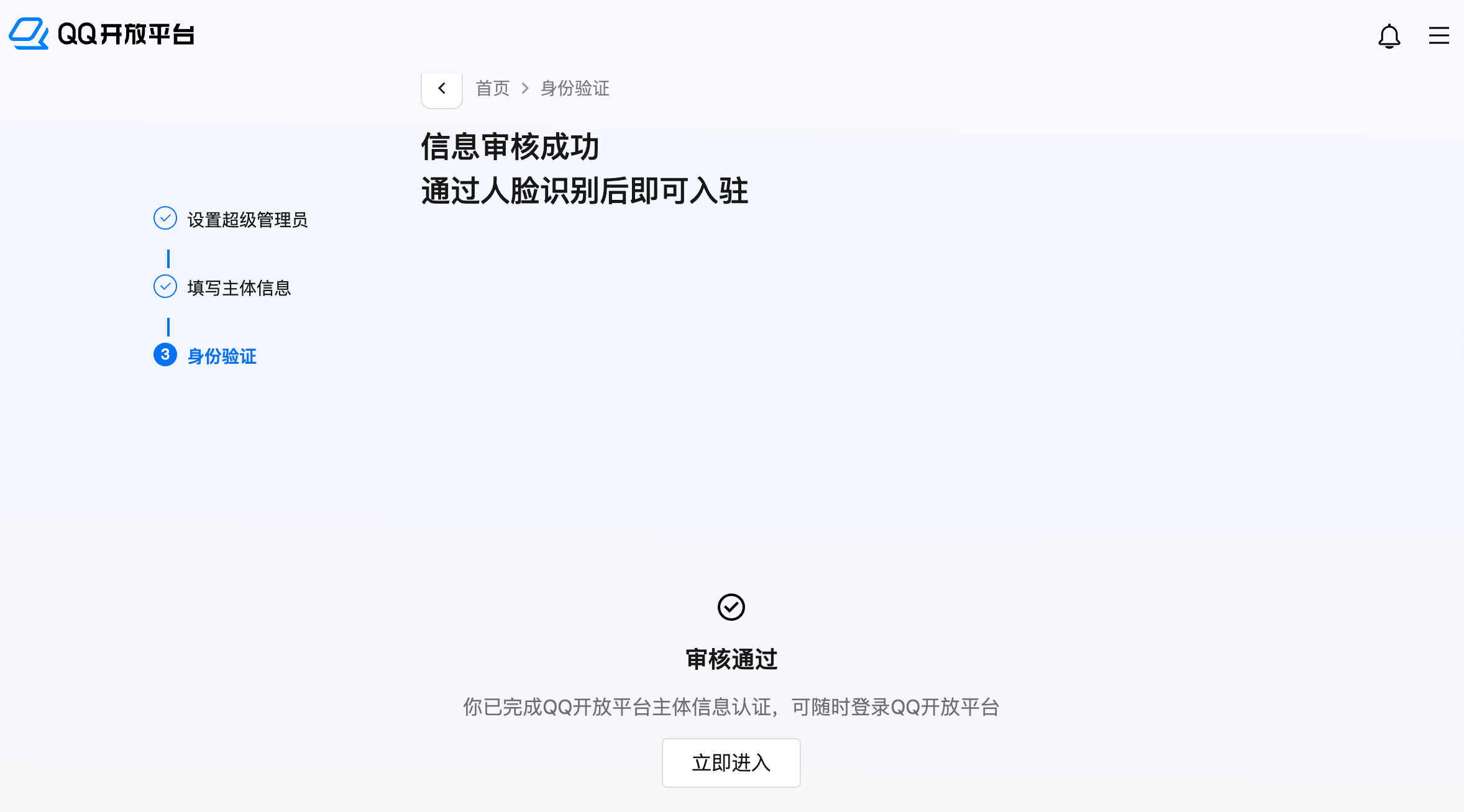 人脸识别审核通过后,即可登录进入 QQ 开放平台。