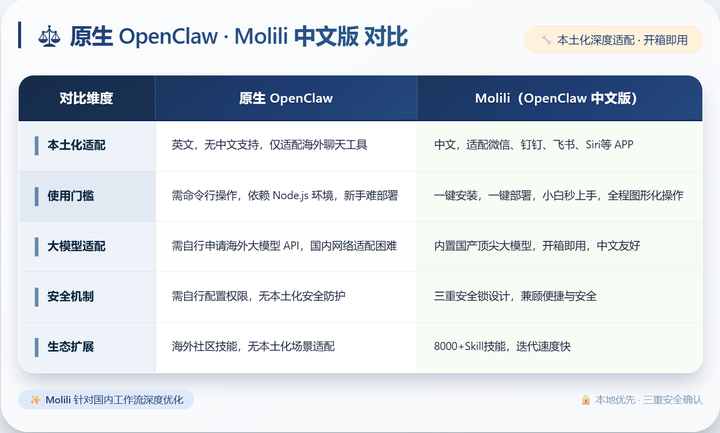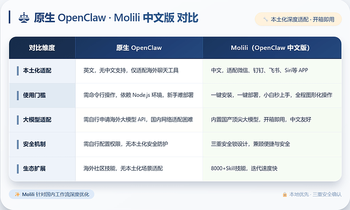 三、Molili与原版OpenClaw的对比:差异化竞争策略