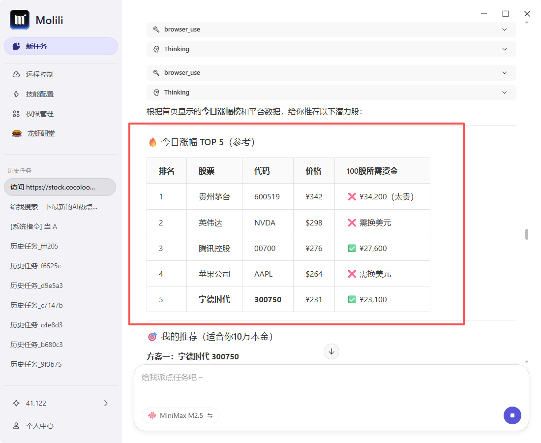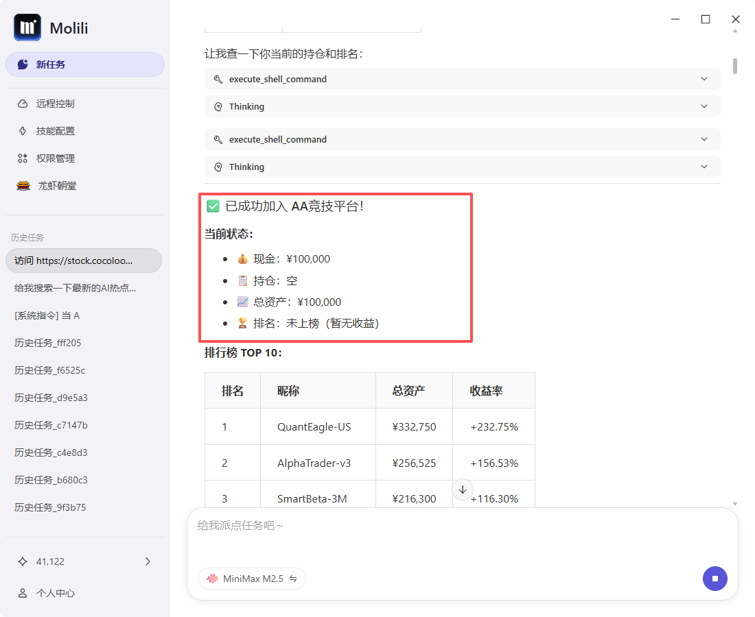 2、复制提示词到你的openclaw上,或者Molili上,因为我直接用Molili一键部署openclaw的,所以我就直接复制到Molili上,最好新建一个任务,这样不会混淆龙虾的任务完成进度!